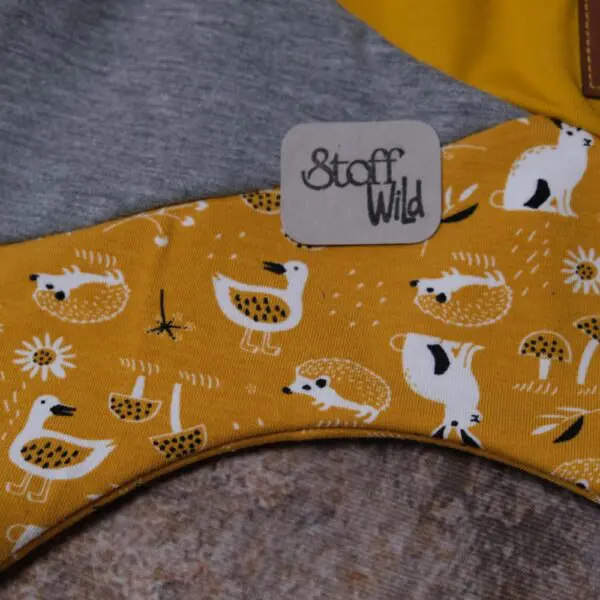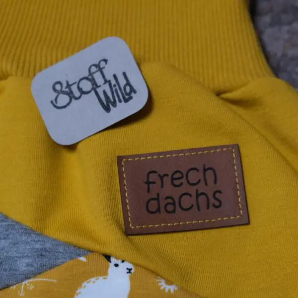 Süsse Mitwachshose / Pumphose mit diversen Unterteilungen, Waldtiere-Motiv und mit einem Kunstleder-Label “frechdachs”.