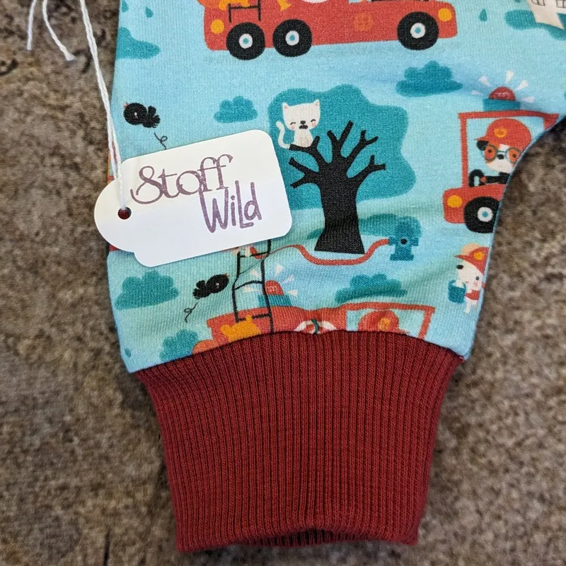 Süsse Baby-Latzhose mit coolem Feuerwehr-Muster, Unterteilung mit Paspel und niedlicher Feuerwehr-Applikation auf dem Oberteil. Die Träger werden oben mit Druckknöpfen geschlossen und an den Beinchen sorgt das Bündchen für optimalen Sitz und Bequemlichkeit 👍