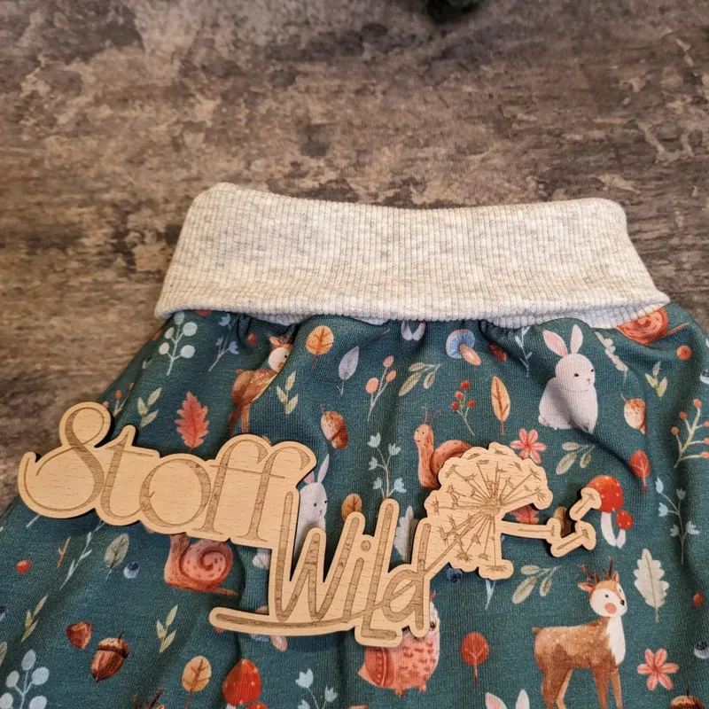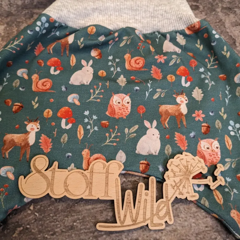 Süsse Pumphose aus weichem Jersey-Stoff mit niedlichen Waldtierchen: Rehe, Eulen, Hasen, Schnecken und viele Blätter, Pilze und Zweige.