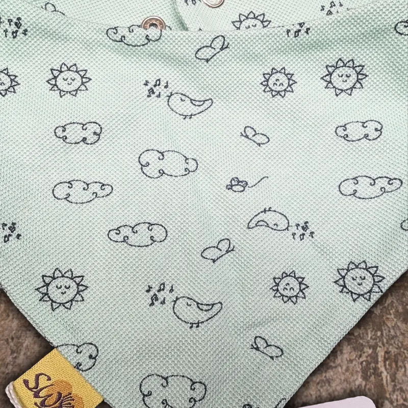 • Besonderheit: Bedruckt mit Wolken, Vögeln, Schmetterlingen, Sonnen und Käferchen, zwei Druckknöpfe für Größenverstellbarkeit.