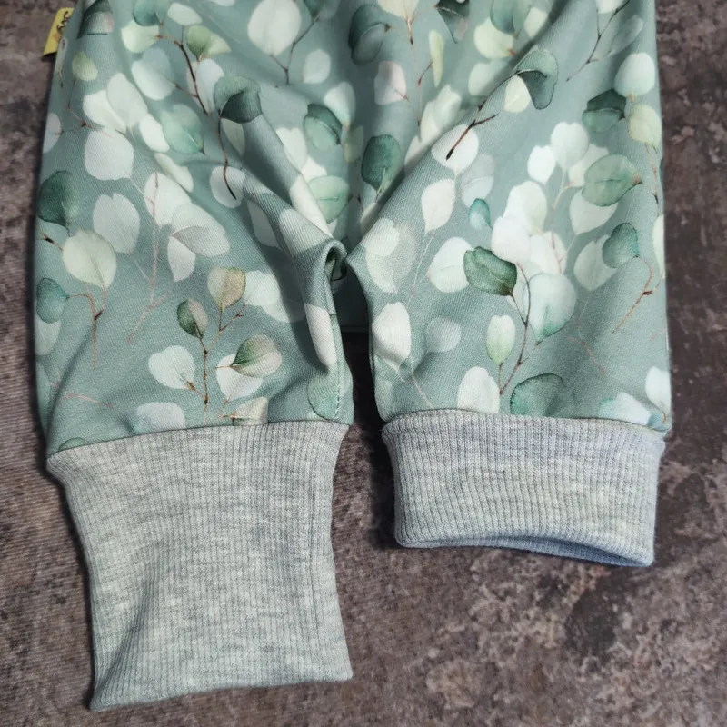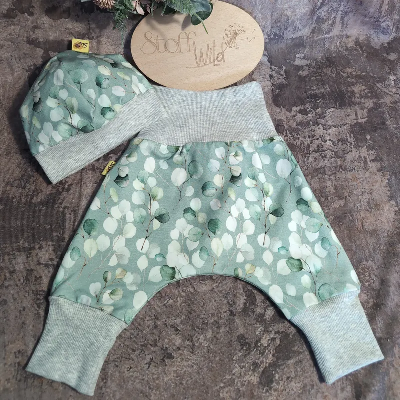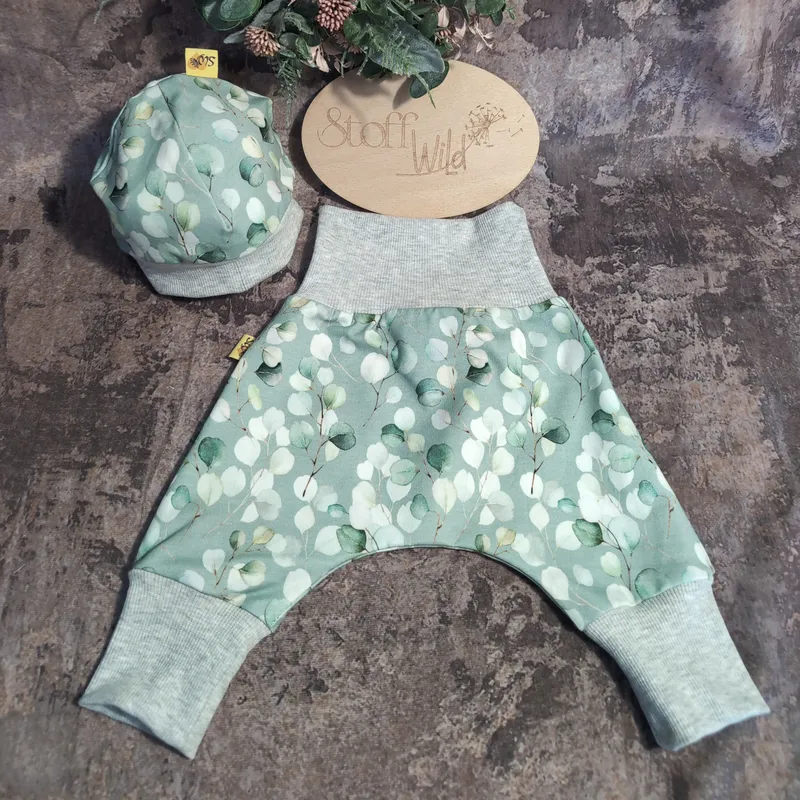 Dieses liebevoll handgefertigte Set aus Pumphose und passender Bündchenhaube ist die perfekte Wahl für alle, die zeitlos schöne Babykleidung mit natürlichen Farben und nachhaltigen Materialien suchen. Der zartgrüne Eukalyptus-Print wirkt beruhigend und harmonisch – genau richtig für kleine Weltentdecker*innen.