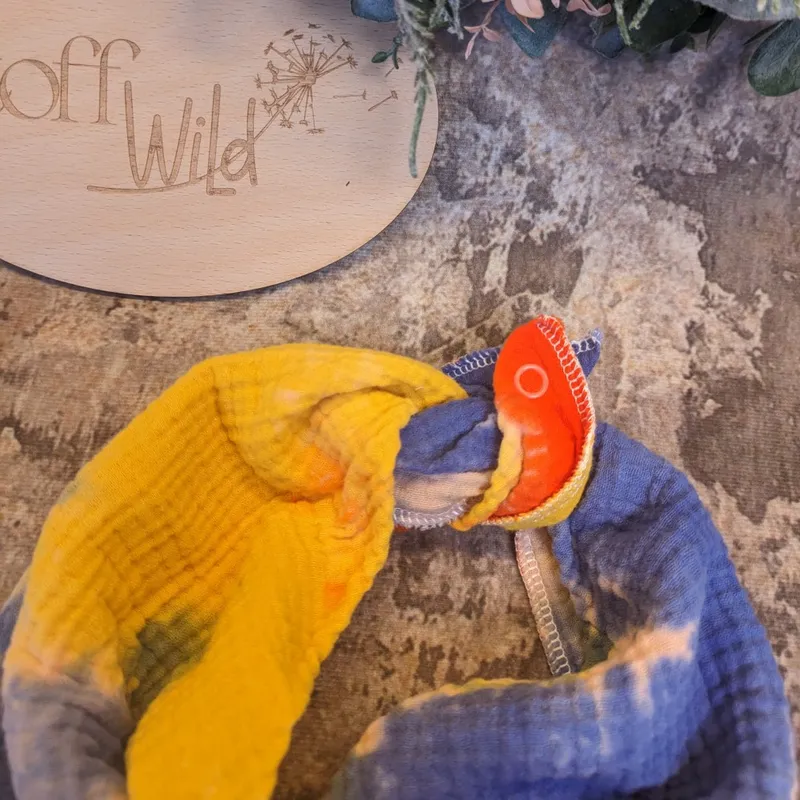 Tipp: Tuch im Nacken knoten und mit dem Druckknopf verschließen – so bleibt es garantiert auch bei wilden Kids am Platz 🧡