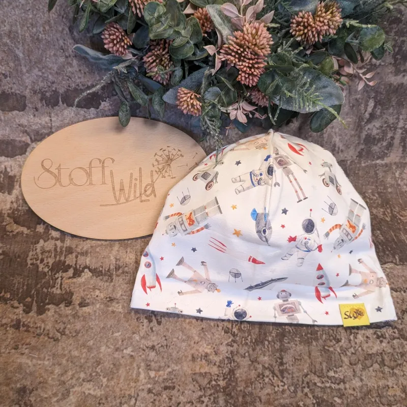Entdecke meine dünne Beanie aus weichem Bio-Jersey-Stoff, verziert mit Raketen, Astronauten und Robotern! Egal ob für Babys, Kinder oder Erwachsene – diese Beanie ist einlagig und kann auch im Sommer als Sonnenschutz oder bei windigem Wetter getragen werden.