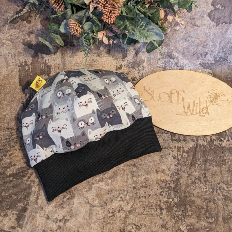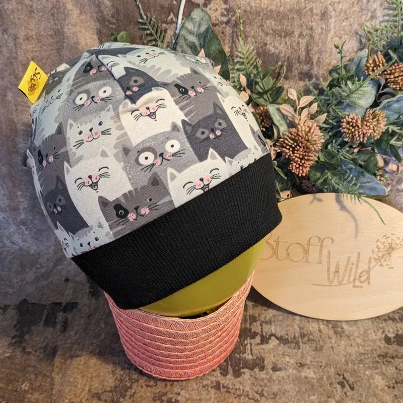 Entdecke meine niedliche Bündchenhaube Cool Cats! Handgemacht aus weichem Bio-Jersey mit einem verspielt-modernen Katzenmuster in Grautönen, ist sie der perfekte Begleiter für jede Jahreszeit. Diese einlagige Haube ist leicht und atmungsaktiv, ideal für Babys, Kinder und sogar Erwachsene.