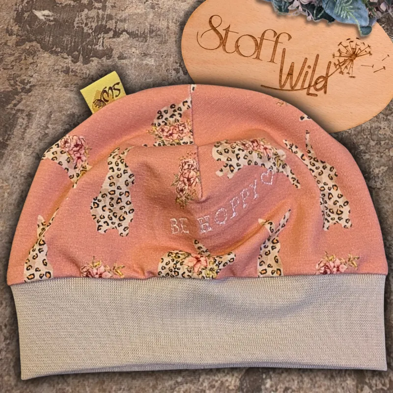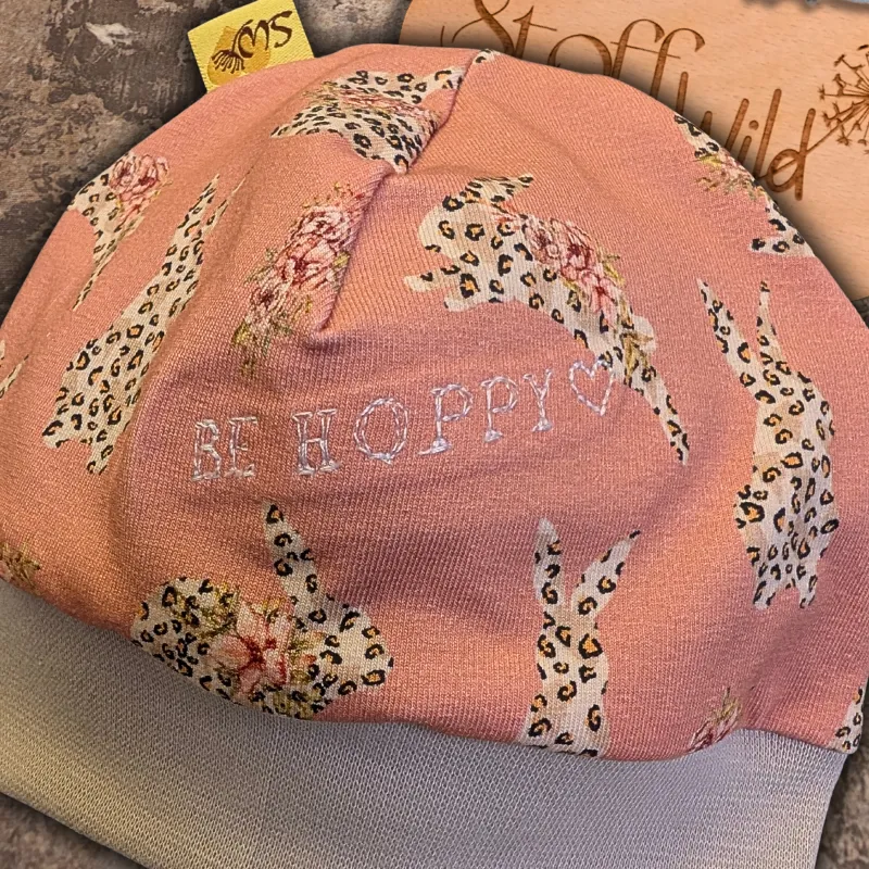 Diese bezaubernde Bündchenhaube in der Größe Gr. S (ca. 39–45 cm Kopfumfang) ist ein absoluter Hingucker! Die Haube besteht aus weichem Jersey und ist mit einem niedlichen Hasenmotiv verziert. Die Bündchen sind in beige/sandfarben gehalten und sorgen für einen perfekten Sitz. Ein besonderes Highlight ist der aufgestickte Spruch „BE HOPPY ❤️“ auf der Vorderseite. Der Stick wurde auf der Rückseite mit einem Fließ versiegelt, um die Haltbarkeit zu erhöhen.