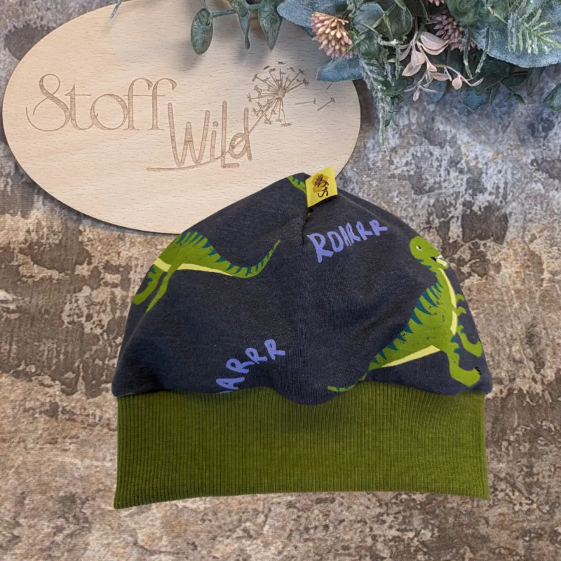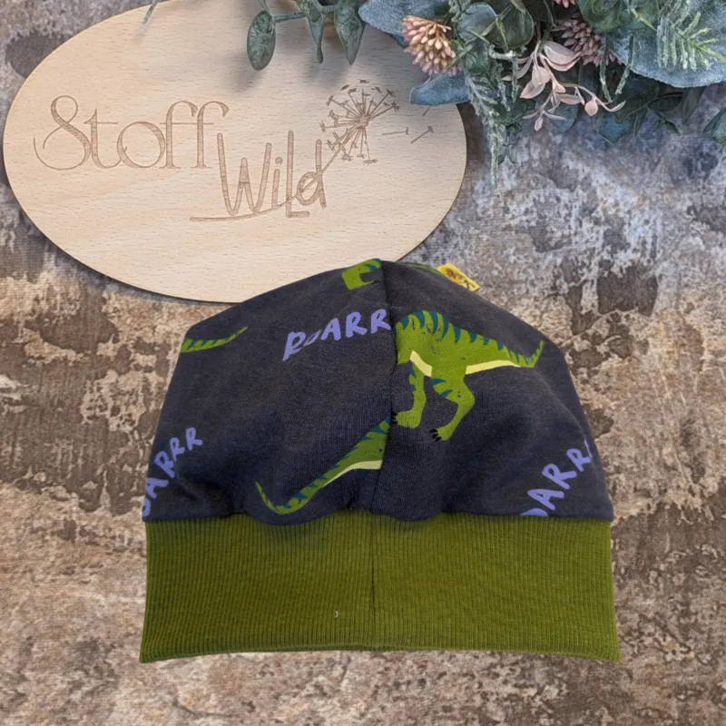 Mit dieser coolen Bündchenhaube wird jedes Kind zum Dino-Fan 🦖! Das auffällige Dinosaurier-Motiv auf jeansblauem Hintergrund und der moosgrüne Bund machen diese Mütze zum stylischen Begleiter für kühle Tage.