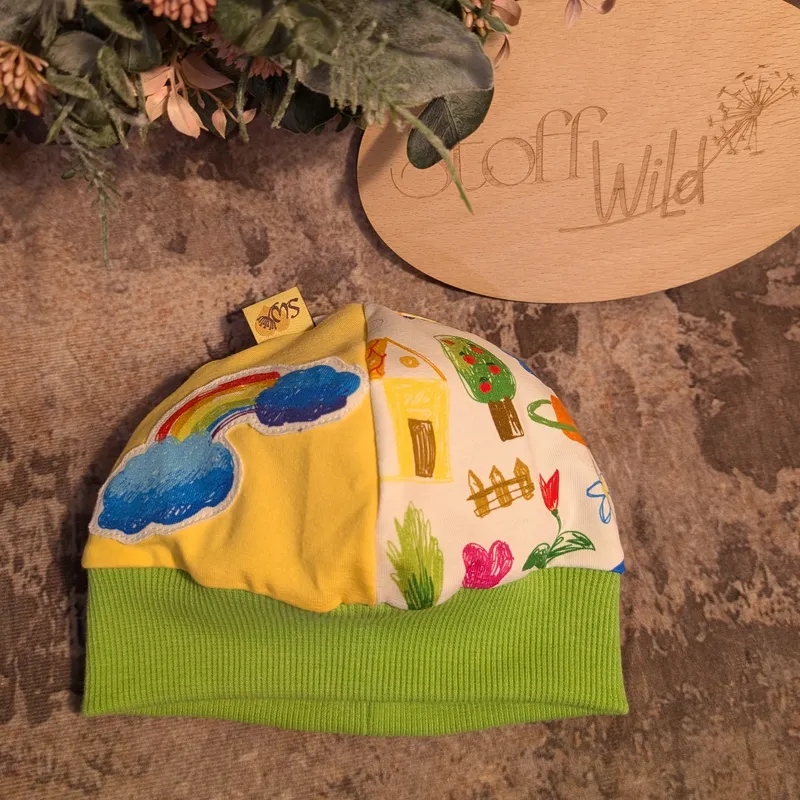 Suchst du eine fröhliche, atmungsaktive Mütze für deinen kleinen Schatz? Diese liebevoll handgefertigte Bündchenhaube aus hochwertigem Jersey-Stoff ist genau das Richtige für dein Baby oder Kleinkind! Sie schützt das empfindliche Köpfchen, ist sanft zur Haut und begeistert mit ihrer farbenfrohen Regenbogen-Applikation. Dank des elastischen Bündchens sitzt sie perfekt und wächst ein Stück mit – für kuschelige Geborgenheit und langanhaltende Freude.