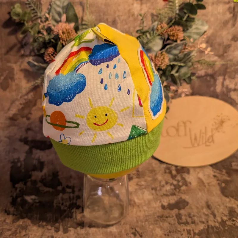 • Zauberhaftes Design: Die fröhliche Regenbogen-Applikation in bunten Farben verleiht der Haube einen verspielten, kindgerechten Look.