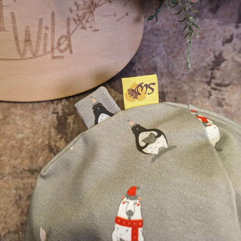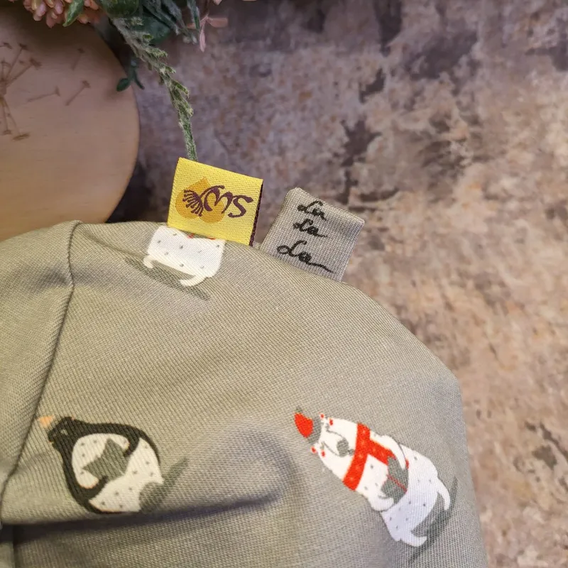 Süsse Bündchenhaube aus weichem Jersey-Stoff mit lustigen Wintertieren: Pinguine 🐧, Eisbären 🐻‍❄️ und ein Rentier-Schwein 🐖 singen fröhlich aus ihren Liederbüchern vor 🎶 🎵