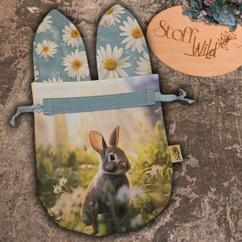 - Besonderheit: Türkis/hellpetrolfarbener Beutel, fotorealistisches Motiv eines Hasen auf einer Blumenwiese, Ohren mit Gänseblümchen-Muster in Weiß und Gelb.