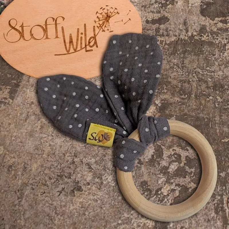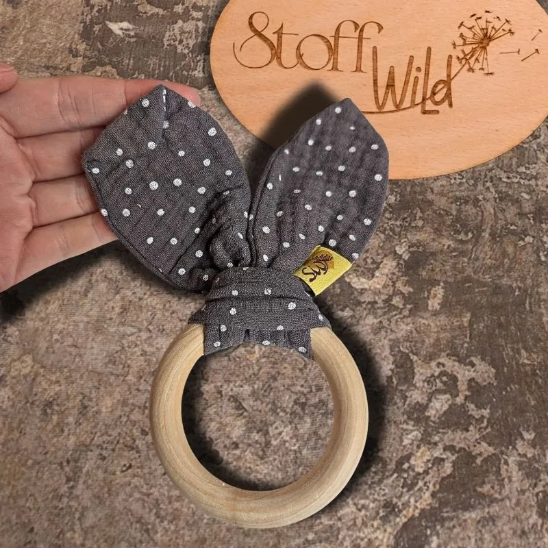 Dein Baby liebt es, die Welt mit allen Sinnen zu erkunden? Mein Hasenohr-Greifling ist das ideale Spielzeug für kleine Hände. Weich, sicher und niedlich! Hergestellt aus zartem Musselin mit süßen Polka-Dots und einem naturbelassenen Holzring, ist er nicht nur ein Hingucker, sondern auch praktisch durchdacht: