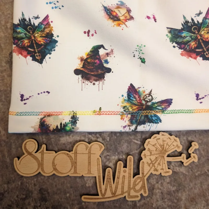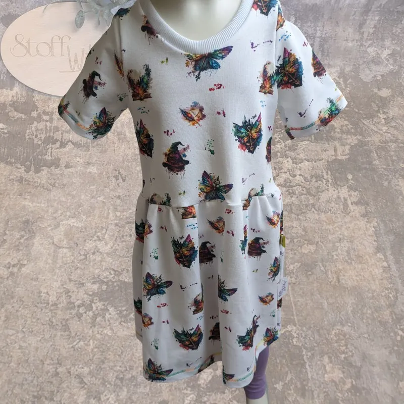 Aus weichem, hautfreundlichem Sommersweat / French Terry gefertigt, ist dieses Kleid ideal für kleine Zauberinnen. Das Kleid zeigt ein einzigartiges, farbenfrohes Muster, das an magische Momente erinnert und für spielerische sowie festliche Anlässe geeignet ist. 🪄 Hier finden sich ein sprechender Hut, verschiedene fliegende Schlüssel, Briefe mit Federn und natürlich ein Zauberbuch.