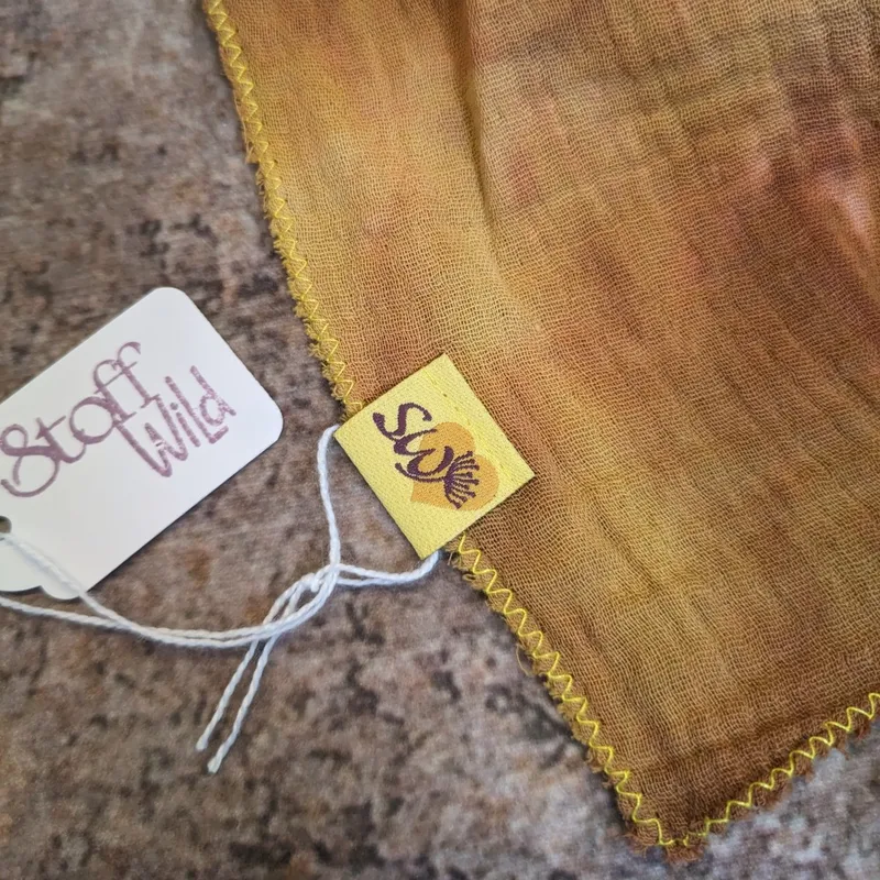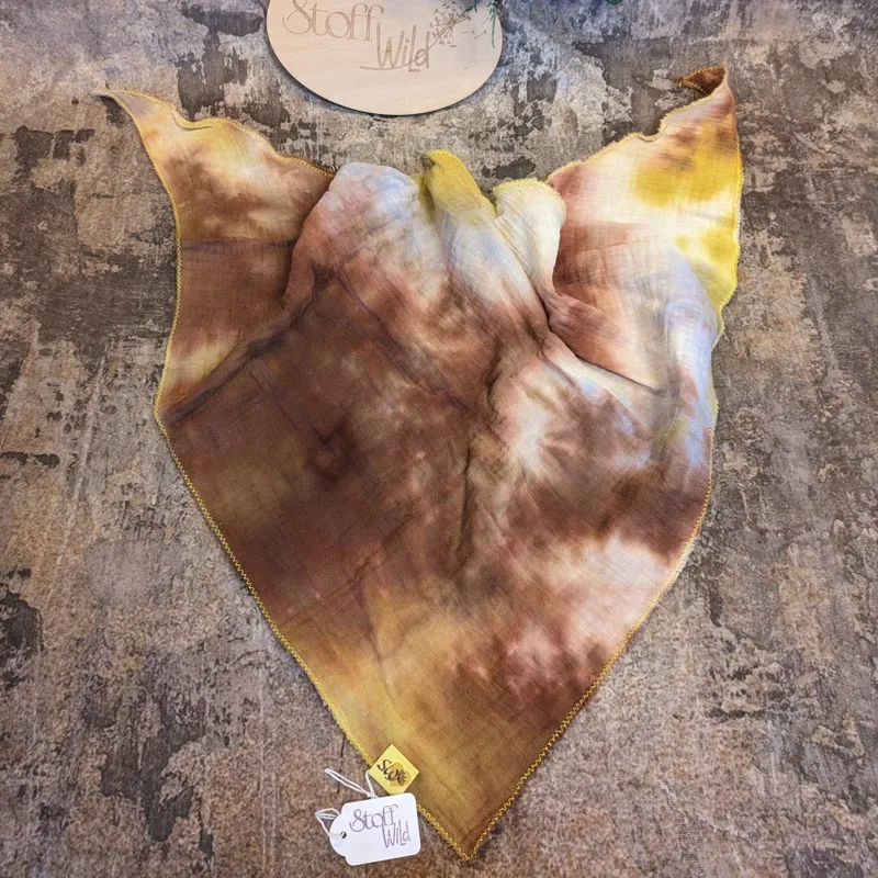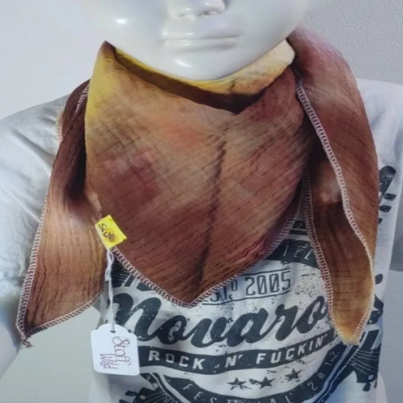 Musselin-Halstuch “Batikmuster braun” mit gelbem Saum, 65x65cm