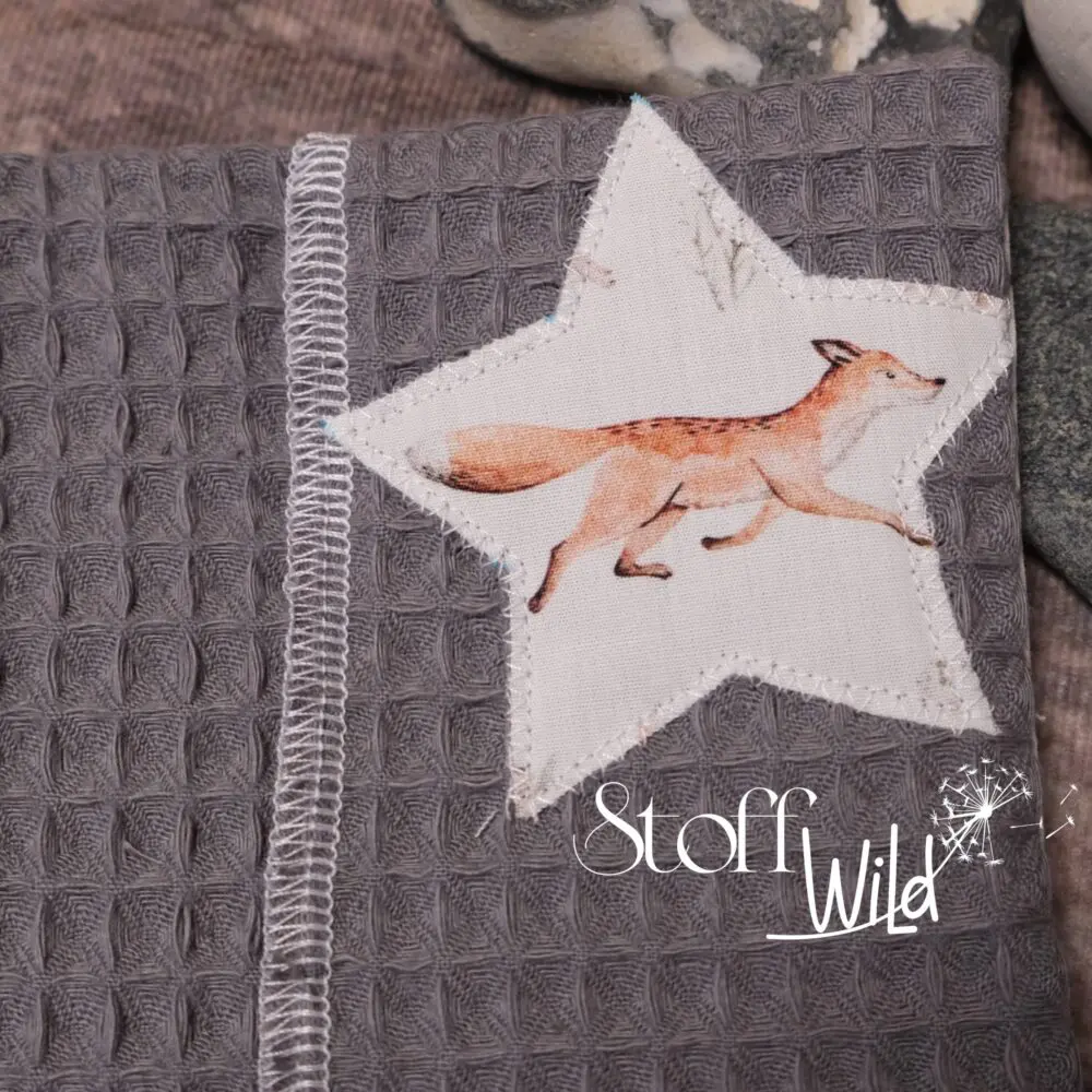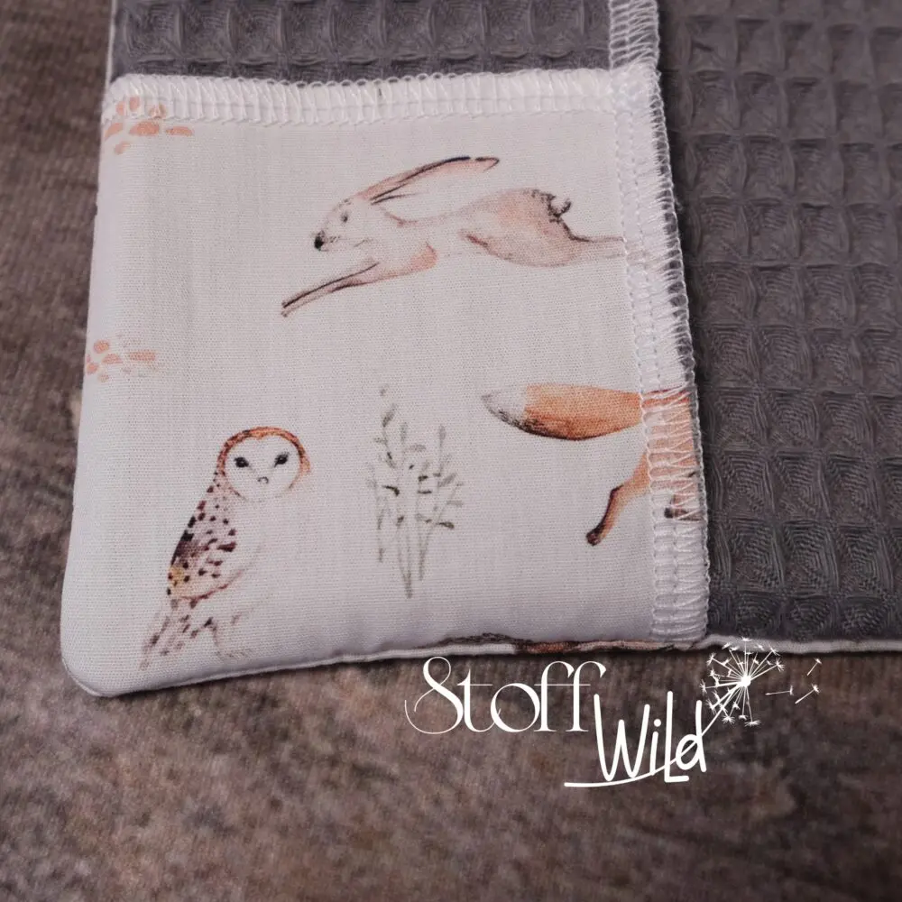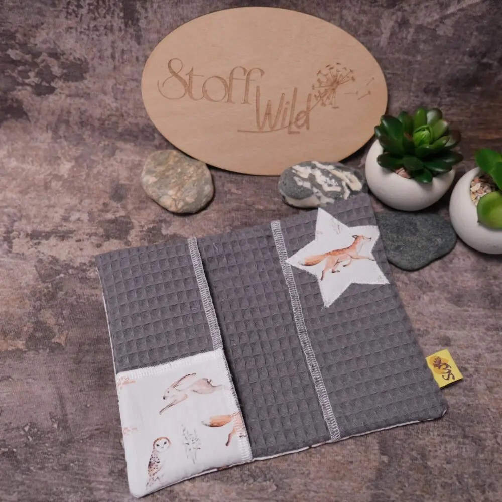 Mutter-Kind-Pass-Hülle mit süssem Waldtier-Motiv (Fuchs, Hase, Reh, Igel, Dachs, Eule, Streifenhörnchen) auf weißem Hintergrund. Die Innenseite ist aus grauem Waffelstoff. Als Highlight wurde aus Außenstoff eine e-Card-Hülle sowie ein Stern appliziert!