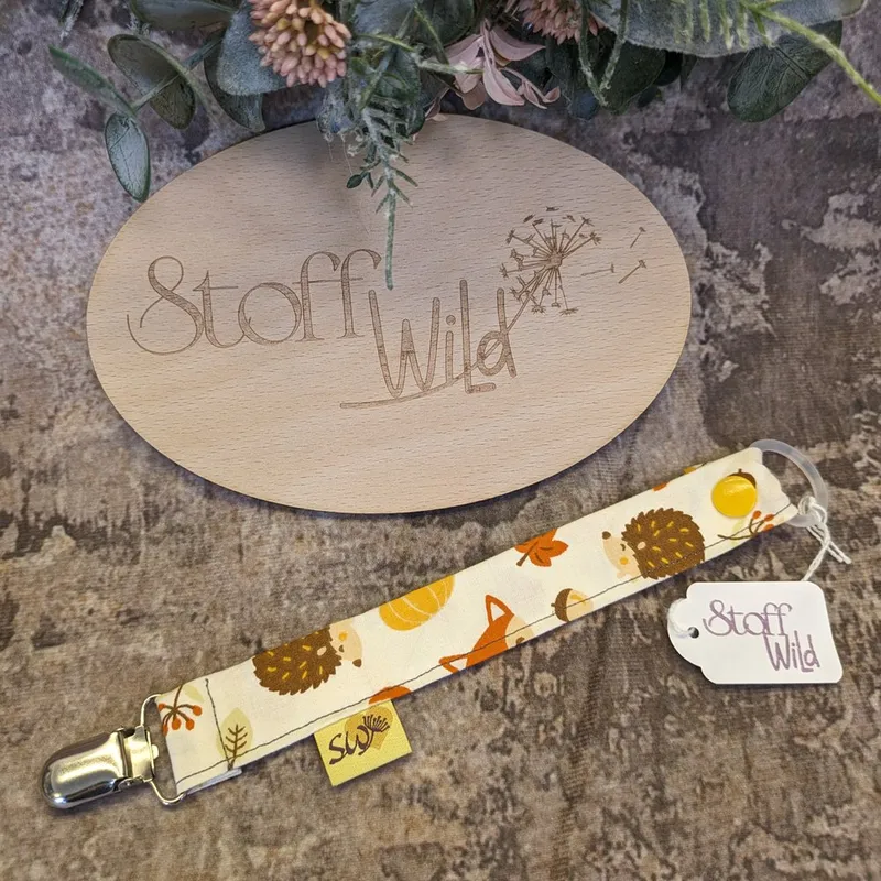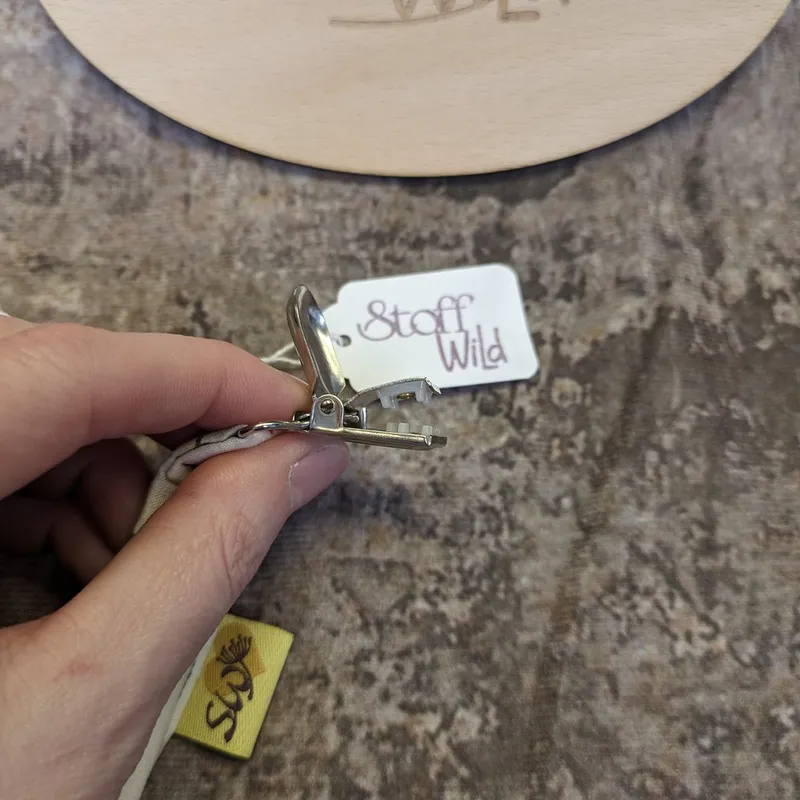 Schnullerband mit Metall-Clip und einen Silikon-Ring-Adapter.