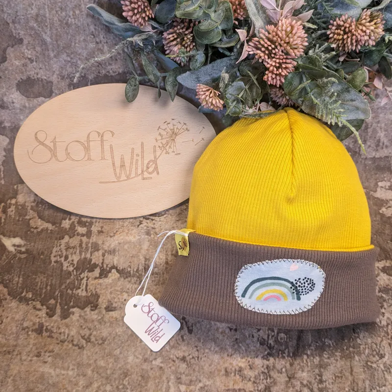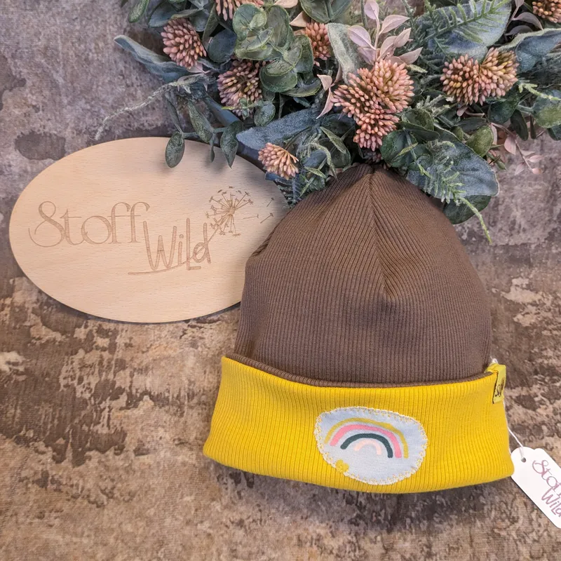 Design: Wendebeanie mit Regenbogen-Applikation, gelber und brauner Ripp-Jersey