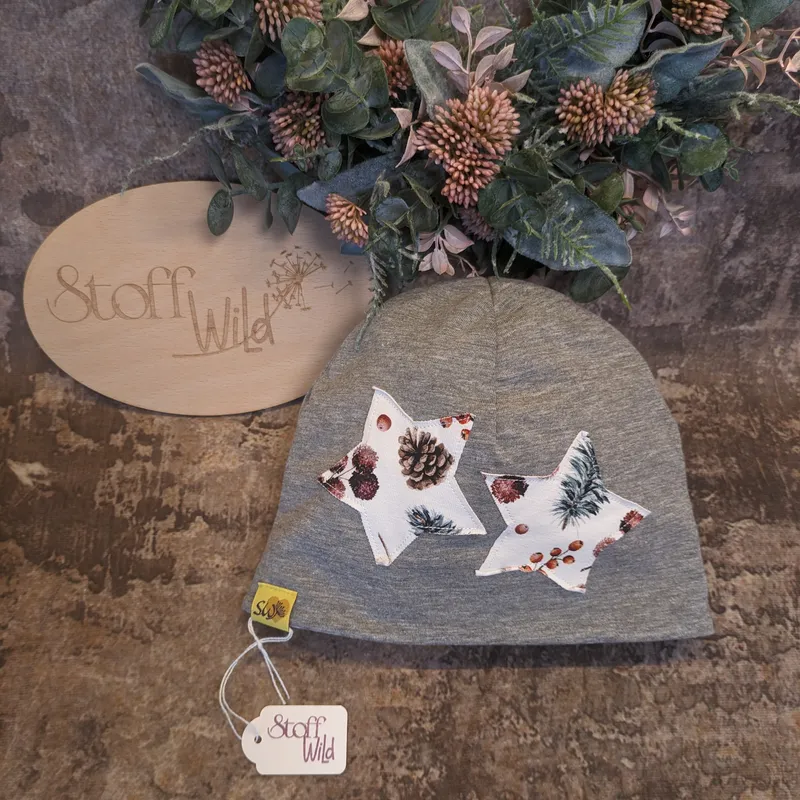 • Zwei Designs in einer Mütze: Die Wendemöglichkeit bietet dir die Wahl zwischen einem zauberhaften Tannenzweig- und Zapfenmuster und einer schlichten, unifarbenen Seite mit Stern-Applikationen – perfekt für abwechslungsreiche Outfits.