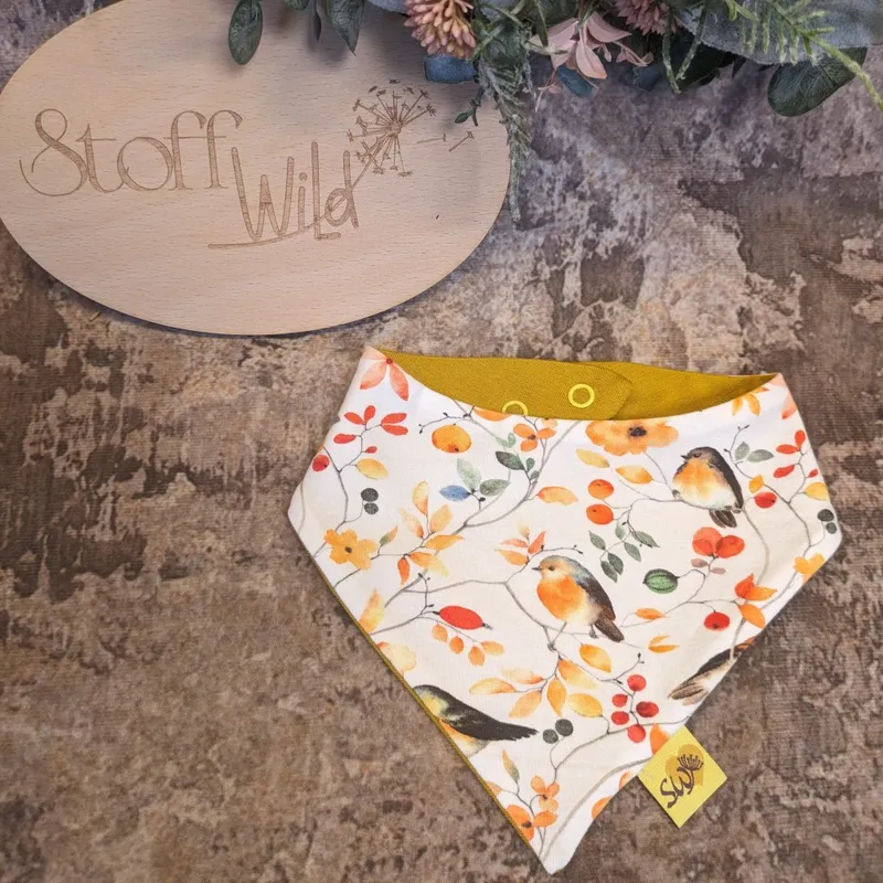 „Das Wende-Halstuch ‚Vögel‘ ist unser absoluter Liebling! Es passt sich perfekt an und ist so weich zur Babyhaut. Dank der Druckknöpfe wächst es einfach mit.“