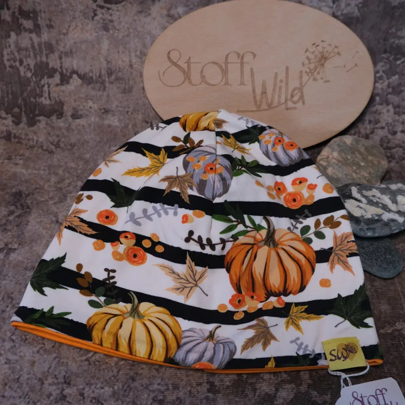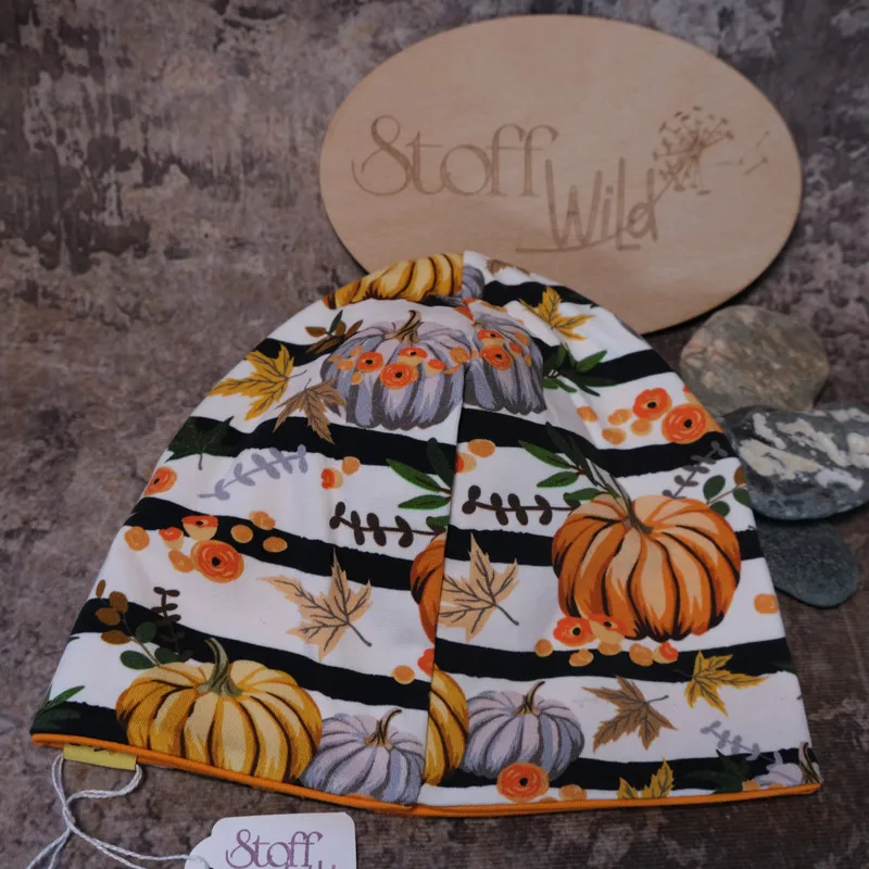 Die Winterhaube kann beidseitig getragen werden: eine Seite hat einen Allover-Print mit tollen Herbst-Motiven: Kürbisse in orange, grau und gelb, Blätter, Blüten und Ahornblätter.